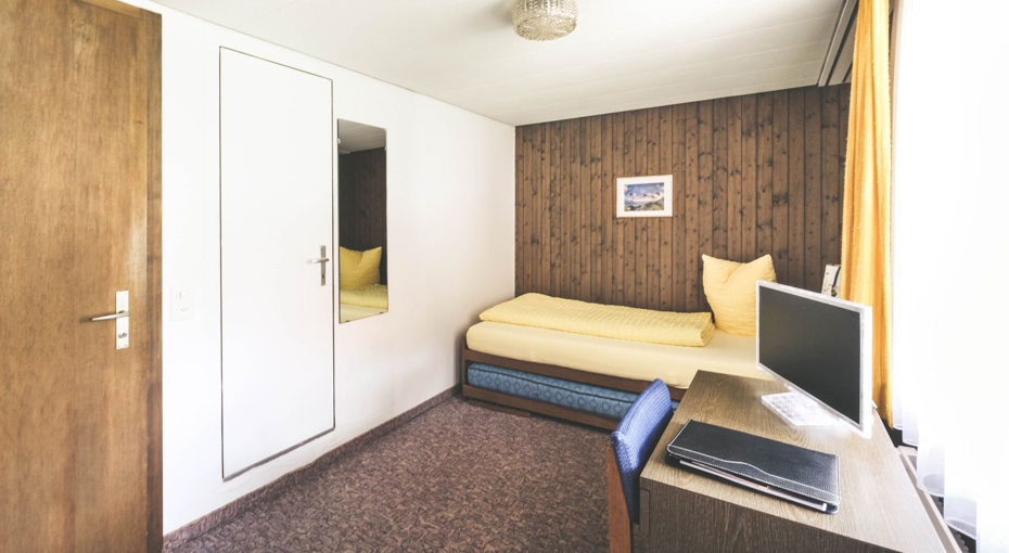 Unsere Budget Einzelzimmer bieten rund 15m², sind zudem mit einem Tisch und einem Stuhl ausgestattet und haben alle Satelliten-TV.